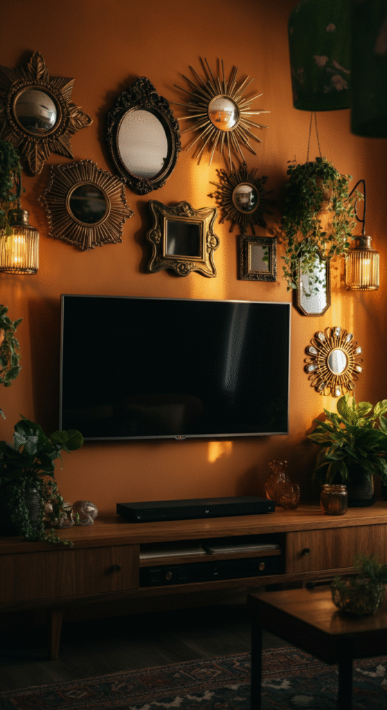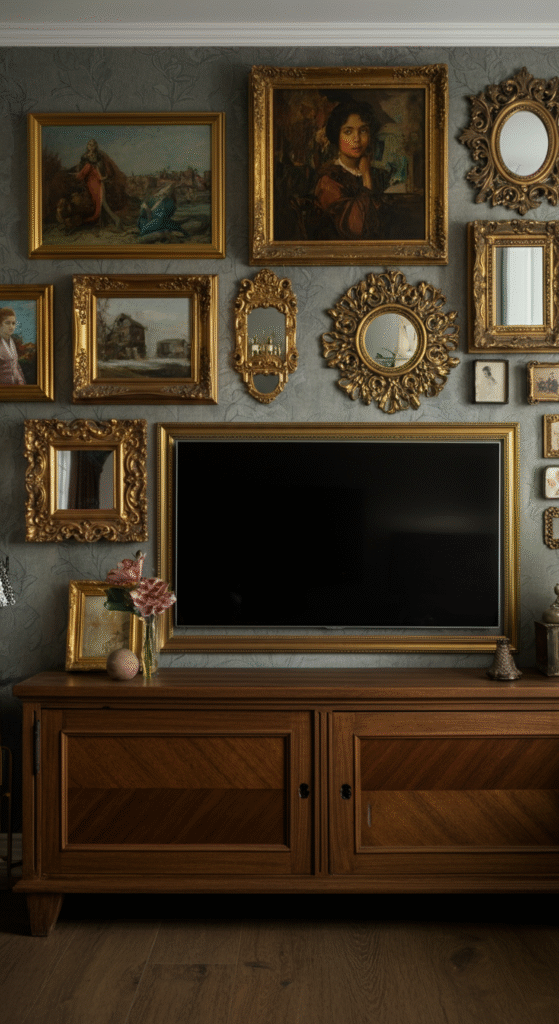 Choose mismatched frames — gold, wood, whitewashed — for that true eclectic charm. Balance the composition so your TV feels intentionally placed, not randomly floating.