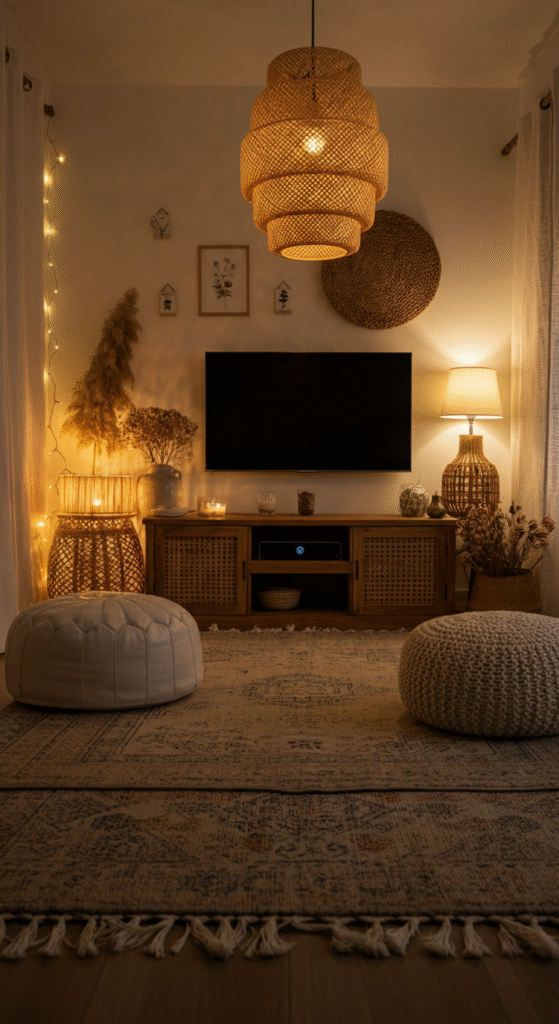 Turn your TV zone into a boho cocoon. Add layered rugs, poufs, floor cushions, and fairy lights. Surround the setup with plants, books, and textiles.