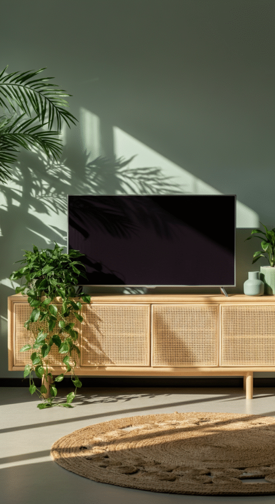 Rattan furniture adds warmth, texture, and an earthy touch — everything a boho room needs. A rattan TV unit or cane cabinet complements plants, pottery, and natural fiber rugs beautifully.
