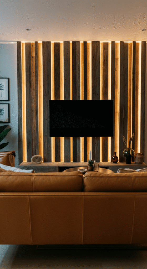 Choose reclaimed or distressed wood for extra character. A matte finish enhances the vintage vibe, while LED strips between slats add soft backlighting.