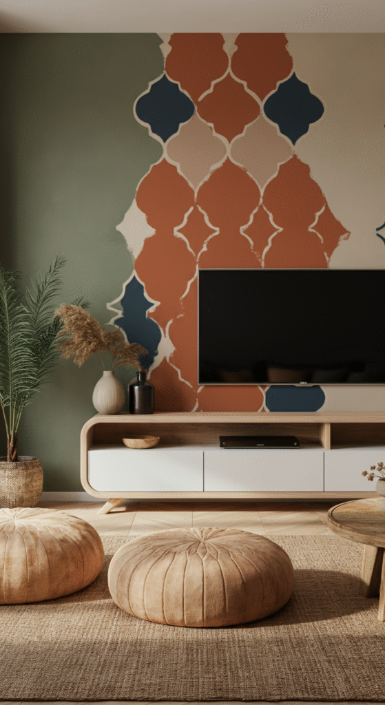 Why stop at neutral walls? Paint a bold Moroccan-inspired stencil behind your TV. Deep blues, terracottas, and ochres can instantly turn a simple wall into an artwork.
