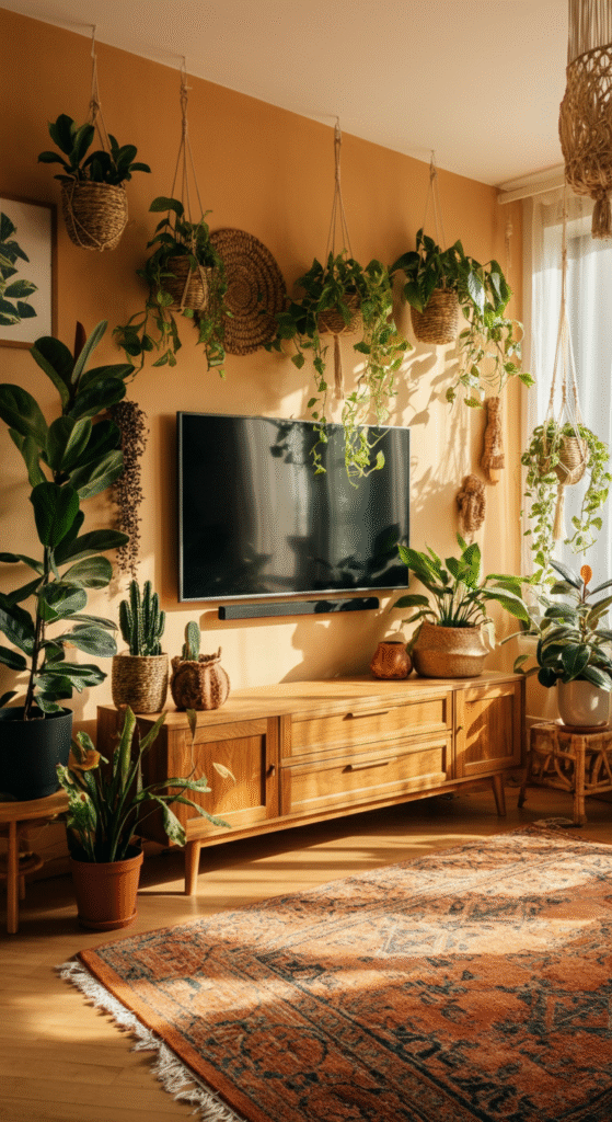 Boho and greenery go hand in hand. Large indoor plants like fiddle leaf figs, monstera, or rubber plants can frame your TV beautifully.