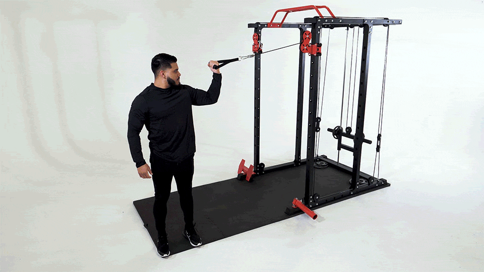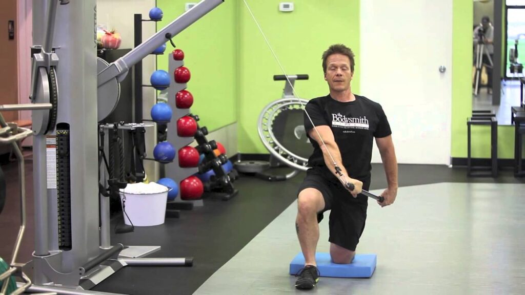 - Attach a rope to the high pulley. Kneel, grab rope handles near your ears.