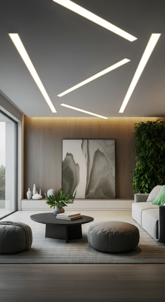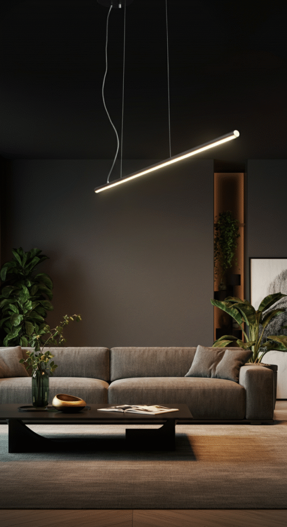 Linear suspension lights are a minimalist favorite. They stretch across the ceiling in a single, narrow form, offering balanced lighting and visual alignment.