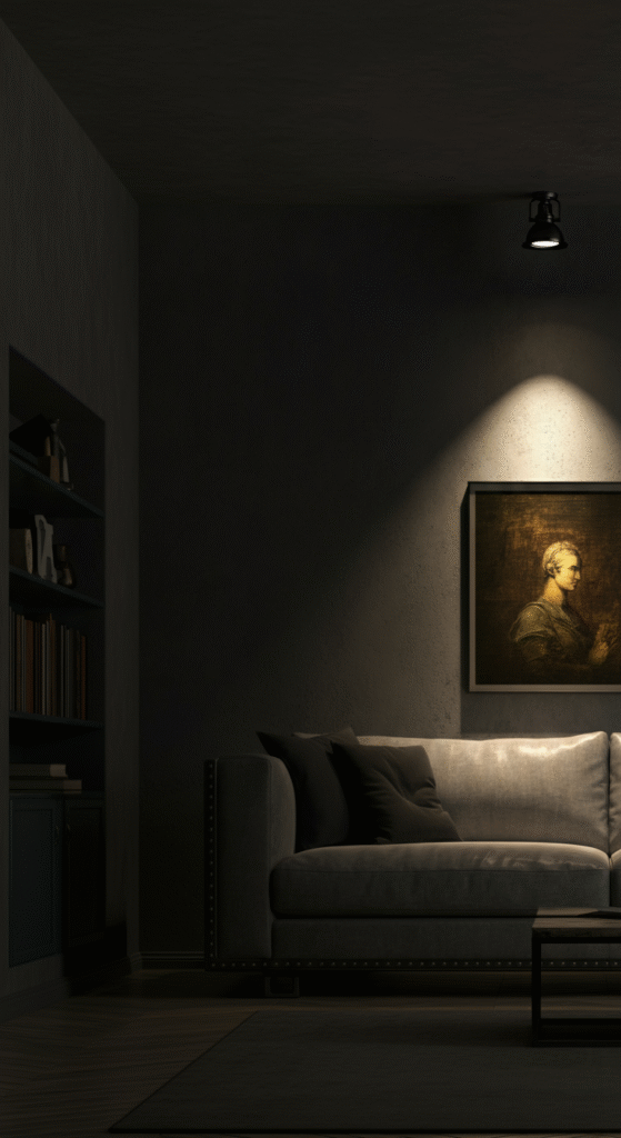 Highlight what matters. Install adjustable ceiling spotlights or recessed fixtures to focus on paintings, photo walls, or stone textures.