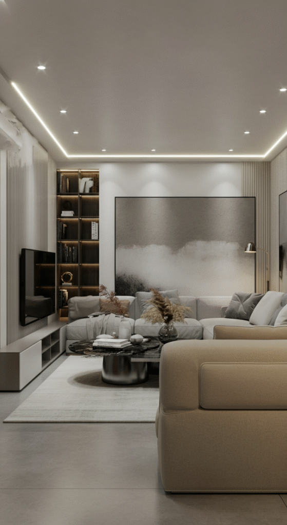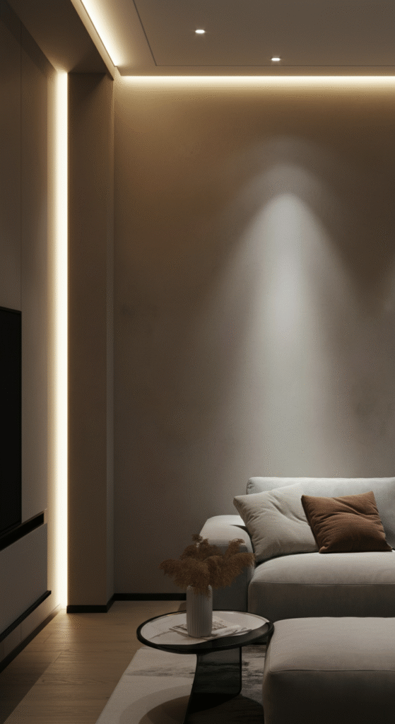 Cove lighting hides the light source behind ledges or moldings near the ceiling edges. The result is soft, diffused illumination that adds elegance without harsh shadows.