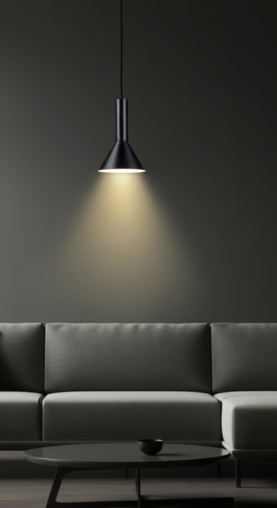 One striking pendant light can serve as a minimalist centerpiece. Think round globes, linear bars, or cone-shaped pendants hanging over your coffee table.