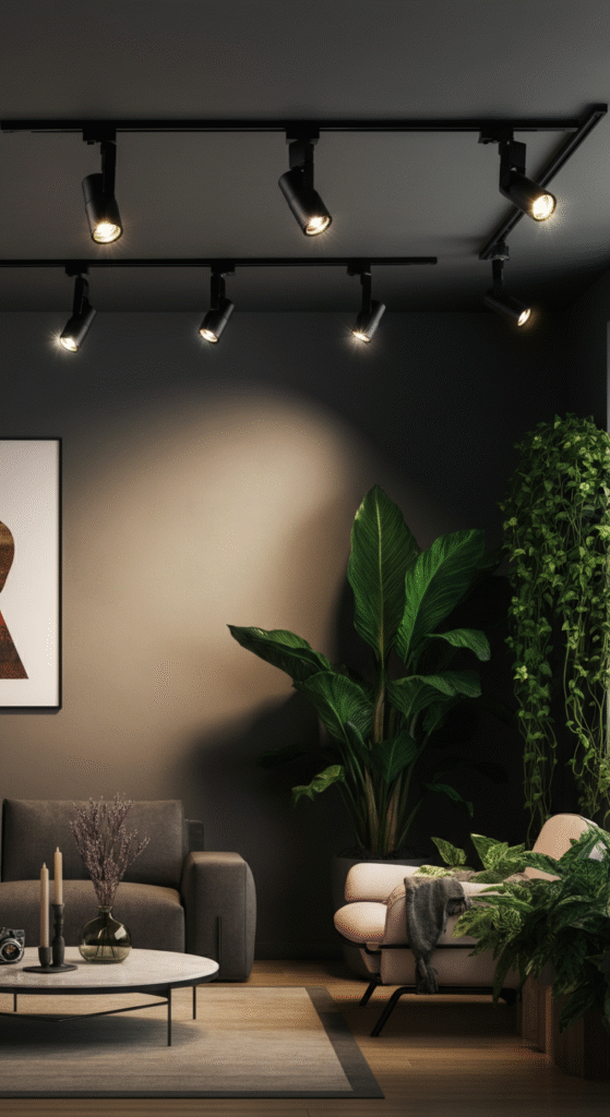 Track lighting brings flexibility. You can adjust each head to highlight wall art, plants, or your favorite reading nook.