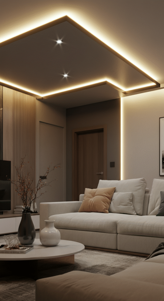 Floating or false ceilings create a layered effect with hidden LED strips along the edges.