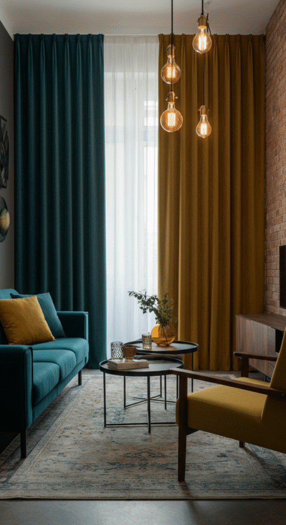 For those who prefer a more industrial or contemporary look, curtains with metal rods or hardware can bring an edgy, urban feel to the living room.