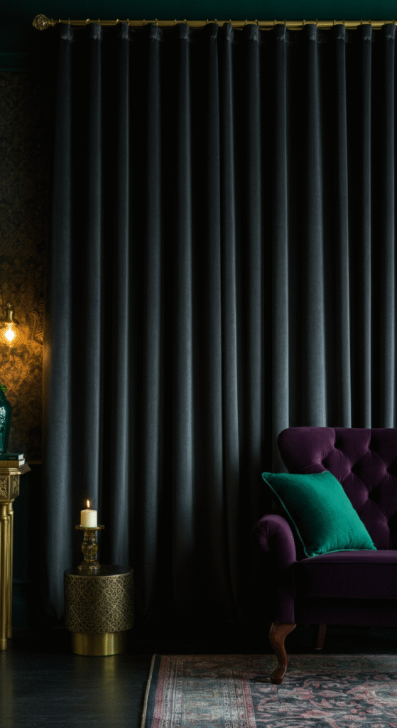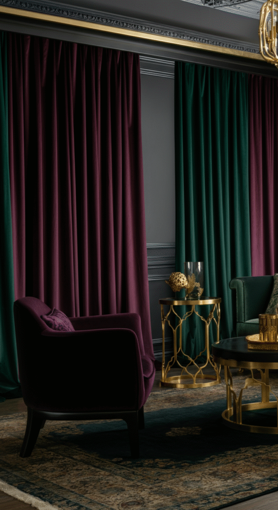 Whether in rich jewel tones like emerald green or deep plum, velvet adds texture and depth to the space.