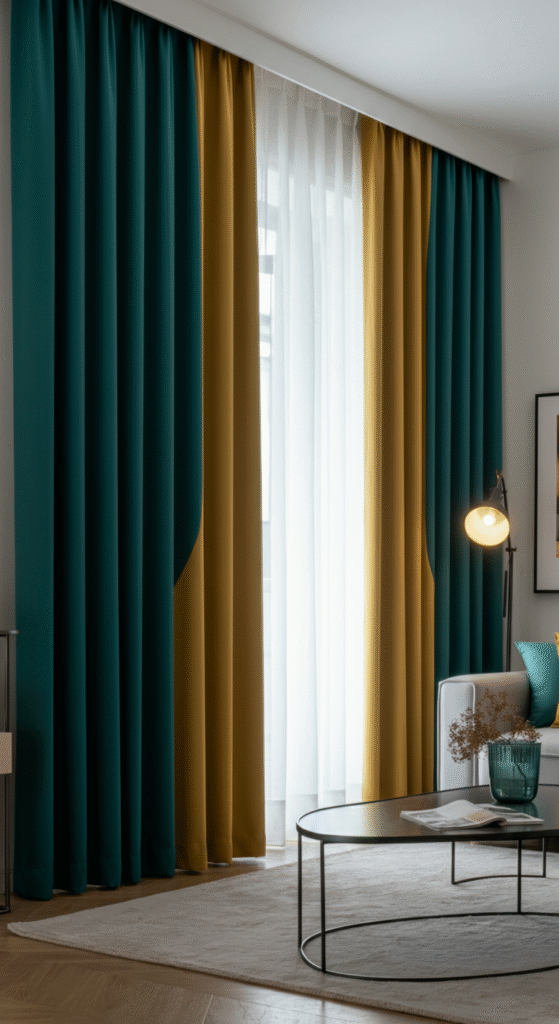 Color-blocked curtains involve using large, bold blocks of contrasting colors. This design style brings a modern, graphic element to the room, offering a fresh take on traditional curtains.