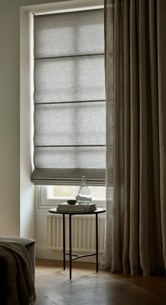 Roman shades provide a tailored, sophisticated look that can work with nearly any interior style. These shades offer the look of a curtain with the practicality of a blind. Roman shades can be made from a variety of fabrics, including cotton, linen, or silk, and are ideal for those who want a neat, uniform appearance.