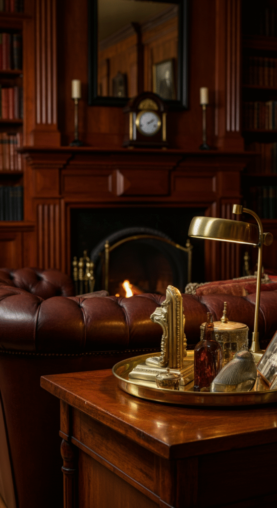 These accents complement dark wood furnishings and leather seating perfectly, adding a soft glow to the room.