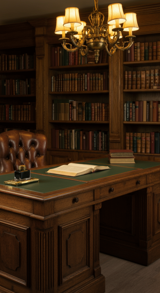 Myth or Fact? The traditional desk with a leather writing pad and quill pen is more than just an office piece—it’s an embodiment of the old-world charm that many intellectuals once relied on to craft their work.