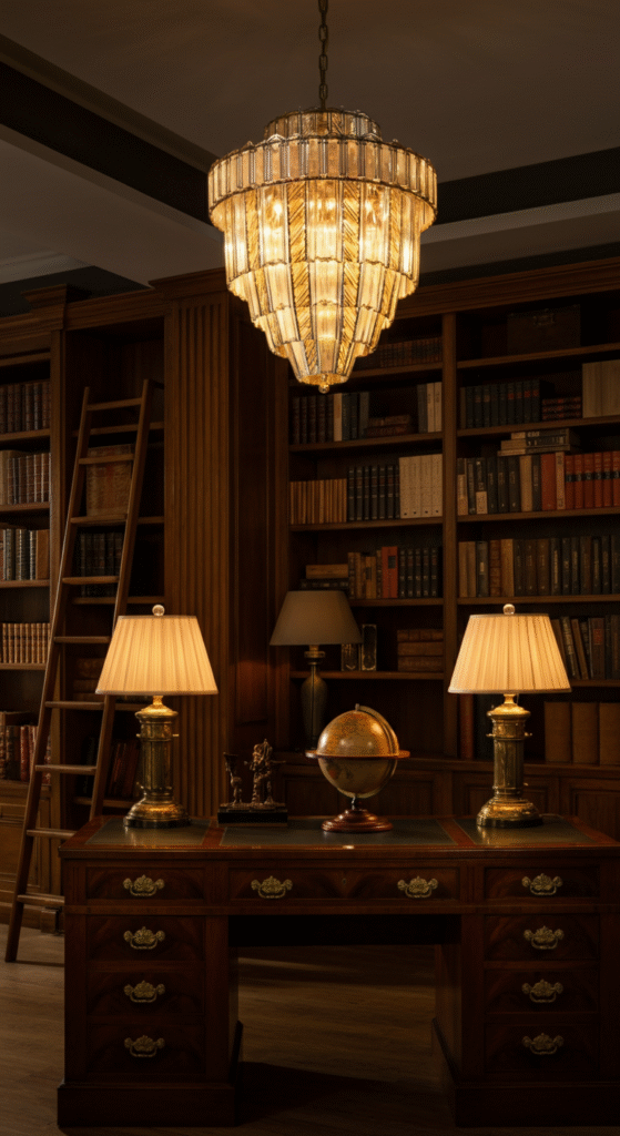 Lighting plays a crucial role in any living room library design. In a traditional setting, opt for art deco-style lighting fixtures to illuminate your space in a way that’s both functional and stylish.