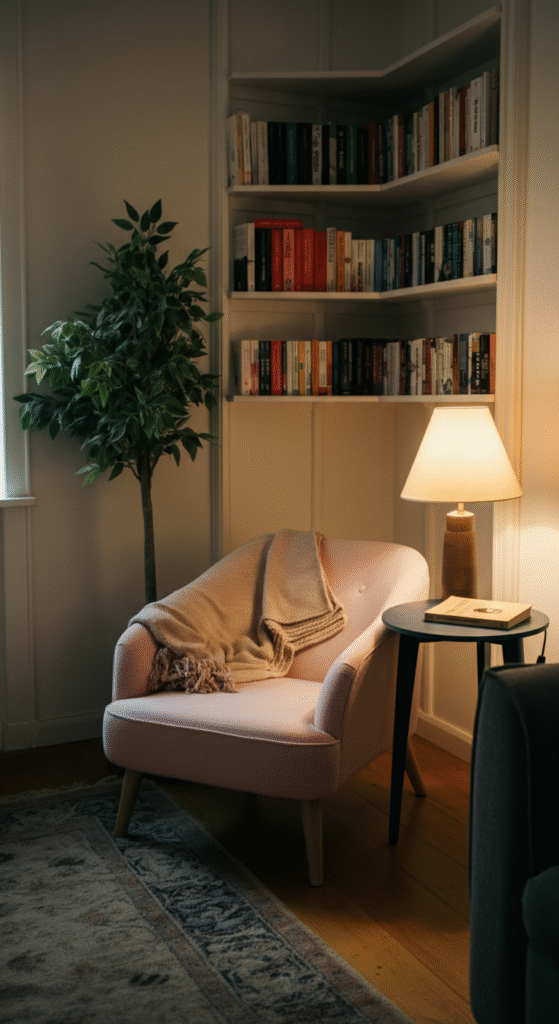 A corner left unused can be the perfect spot for a cozy reading nook. Add a comfortable chair, a small table, and a reading lamp to transform the space into your own little escape.