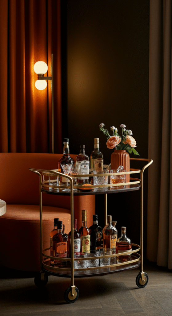 If you have an empty space near your living room, why not use it to create a stylish bar cart area? A vintage or modern bar cart can fill the space while providing a functional area for entertaining. Add glassware, a decanter, and a few bottles of your favorite drinks to complete the look.