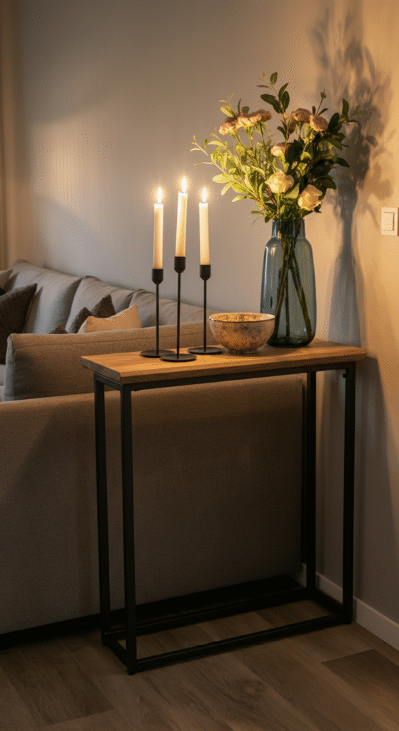 A console table is a versatile addition to your living room. Place it behind your sofa and use it to display decorative objects, candles, or even a stylish lamp. It’s a practical and chic way to fill that awkward space behind your couch.