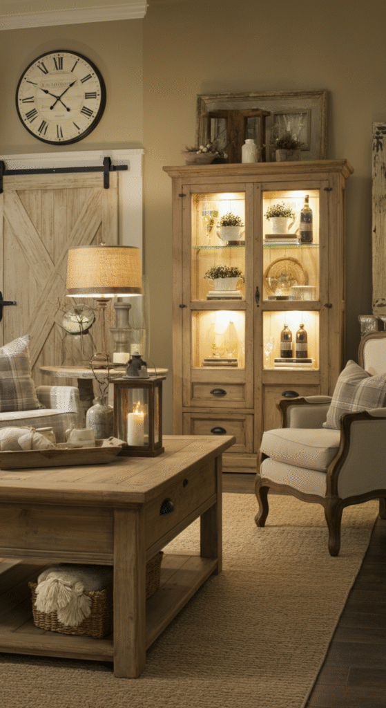 To keep it from feeling too country, balance out the rustic details with sleek, modern accessories. A farmhouse living room often includes plenty of cozy touches—plush throws, textured pillows, and soft lighting.