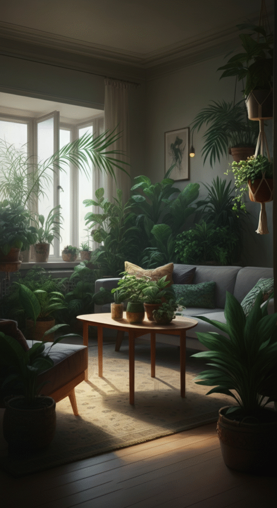 Opt for large leafy plants, like monstera and snake plants, paired with earthy-toned furniture. Incorporate hanging planters, macramé, and botanical prints to reinforce the jungle vibe.