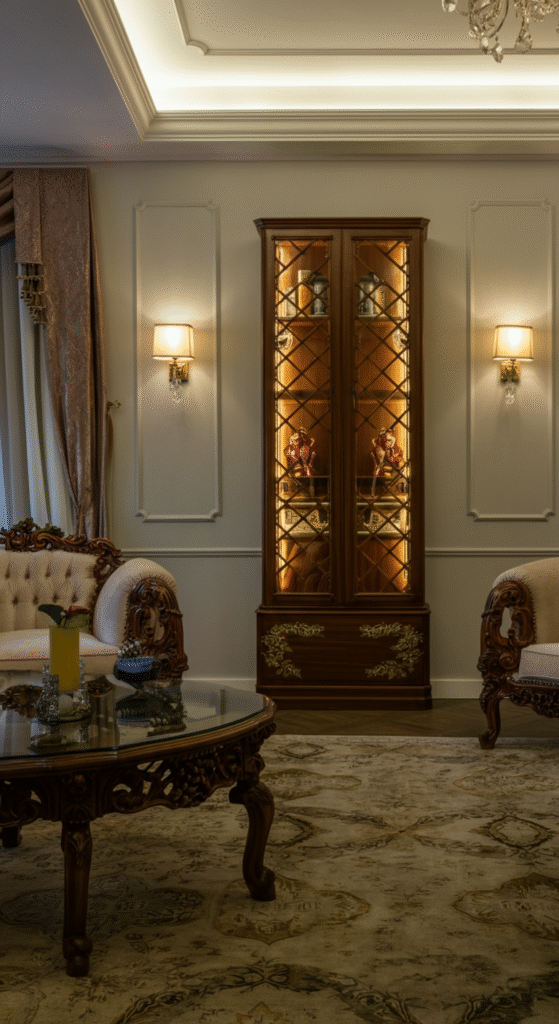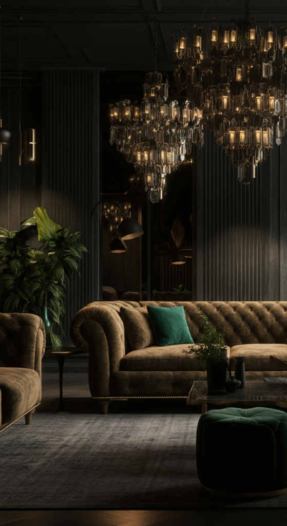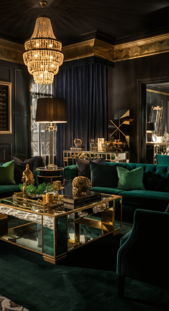 To achieve this look, incorporate mirrored furniture, plush velvet sofas, and intricate details like gold trim and ornate lighting. Pair with dramatic artwork or statement pieces to make the room feel grand.