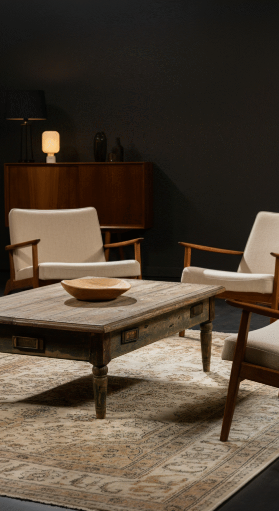 Look for retro sofas, mid-century modern coffee tables, and vintage-style light fixtures. Soft textiles, like floral print cushions or velvet upholstery, add texture and comfort to the space.