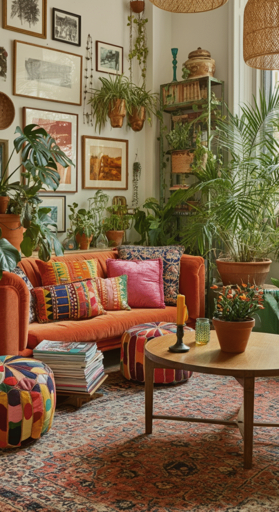 Layered rugs, vibrant cushions, and an eclectic mix of furniture pieces come together to create a space that’s full of personality. Don’t forget to include plants—greenery adds life to the boho vibe.