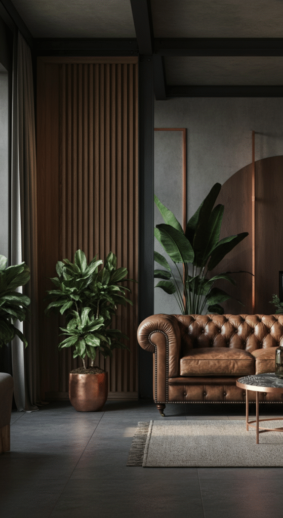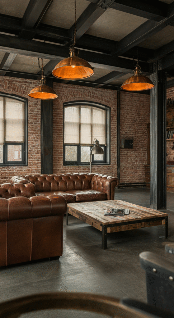 Industrial design brings an urban edge to the living room. Exposed brick walls, steel accents, and reclaimed wood furniture create a raw yet sophisticated look. This style works particularly well in lofts or apartments with high ceilings and plenty of natural light.