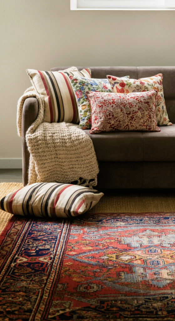 - Use patterned rugs or wall hangings to bring contrast without overwhelming the space.