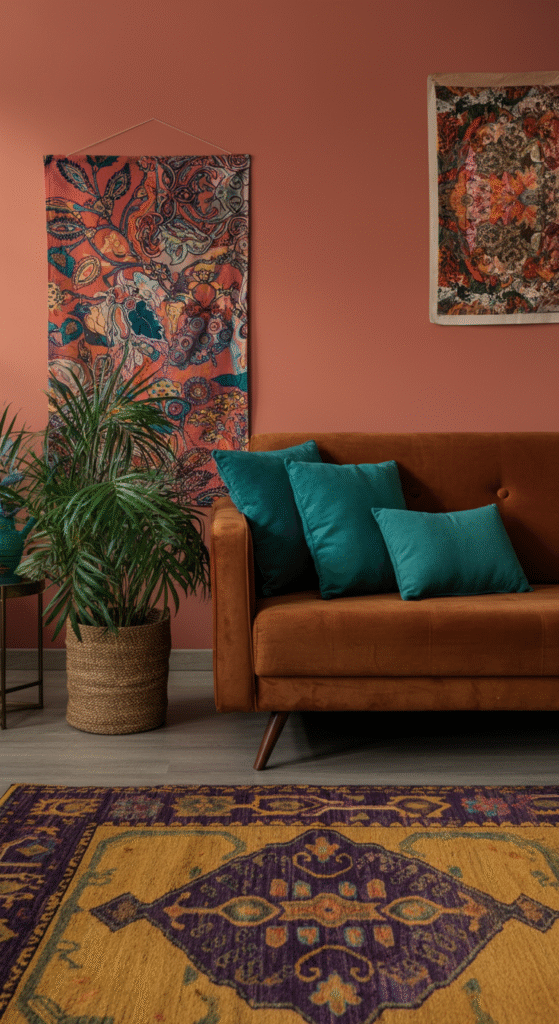 The vibrant color palette of Boho design is inspired by nature—sunset oranges, earthy browns, sky blues, and forest greens. These colors evoke a sense of groundedness, making your living room feel both lively and connected to the natural world.