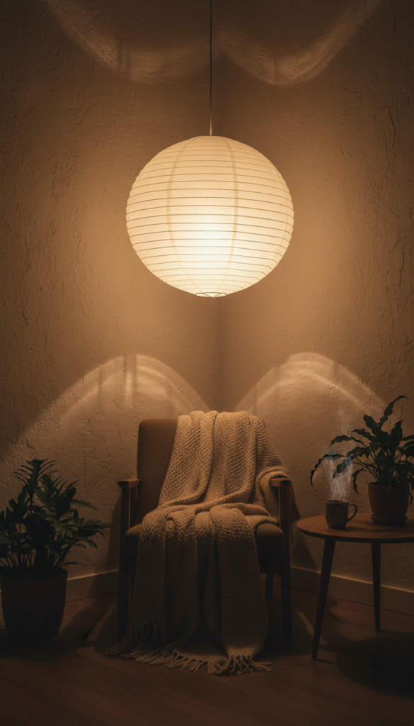 Harsh overhead lighting is the enemy of zen. Replace standard fixtures with paper lanterns or Akari-style lamps. These delicate sculptures diffuse light through washi paper, casting a warm, moon-like glow that softens every corner of the room. The organic, often asymmetrical shapes fit perfectly with the bohemian love for natural materials.