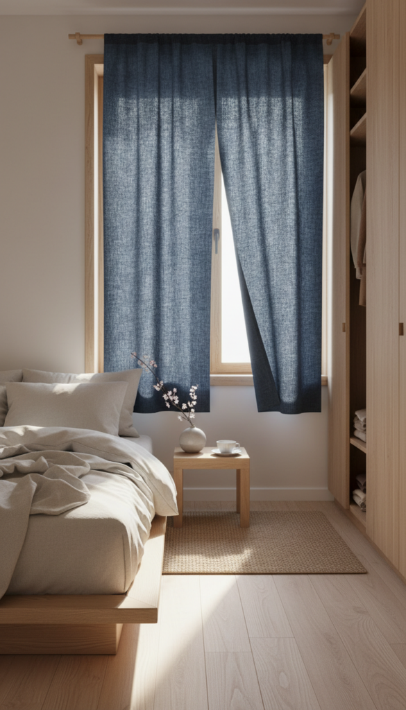 Noren curtains are traditional Japanese fabric dividers hung in doorways or windows. They usually feature a split down the middle. To bring in the boho element, look for Noren made of heavy linen or unbleached cotton in earthy tones like terracotta, indigo, or beige. They add privacy without closing off the flow of air and energy (Qi).
