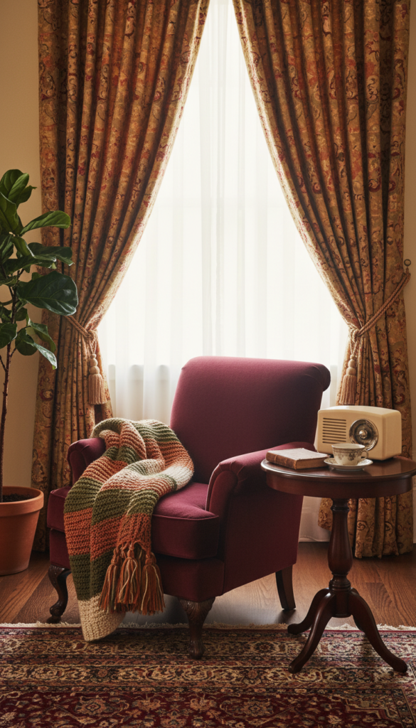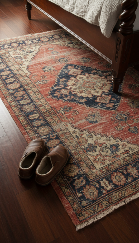 Ground your space with patterns that have history. A faded Persian or Oriental rug adds warmth, color, and intricate pattern to the floor. It creates a “lived-in” feeling that is essential for a vintage aesthetic, preventing the room from looking too staged or pristine.