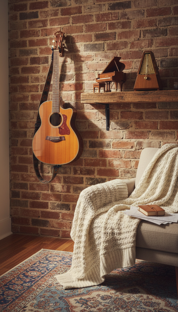 You don’t have to play an instrument to appreciate its form. Incorporating actual instruments or decor inspired by them is a literal interpretation of the theme that works surprisingly well. An old acoustic guitar mounted on the wall or a lamp base shaped like a clarinet can serve as a stunning focal point.