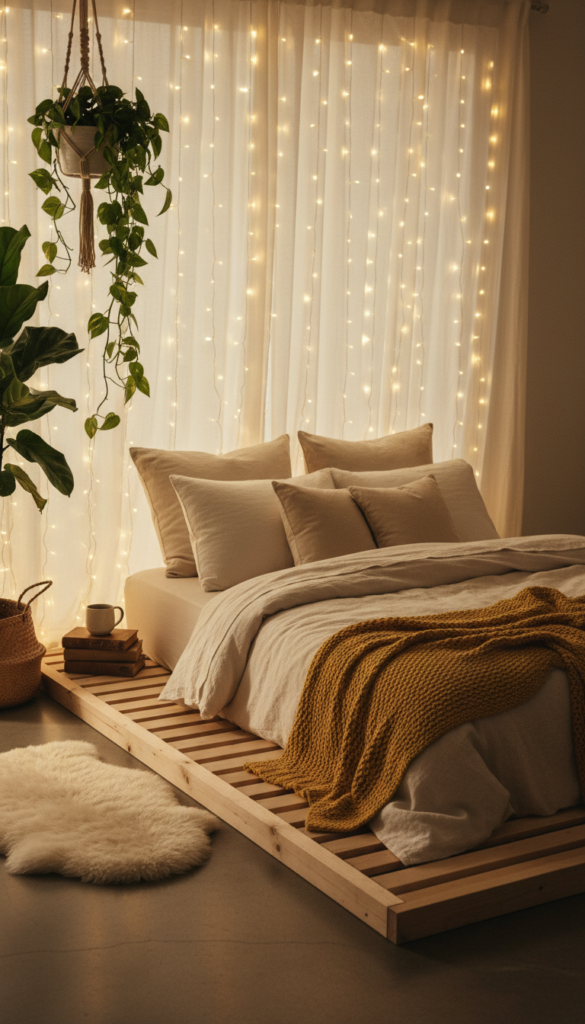 Nothing says “boho” quite like the twinkle of fairy lights. They add a whimsical, magical quality that instantly softens the room. Instead of just stringing them in a straight line, try creating a curtain effect behind your bed or draping them loosely over a floor-length mirror. The key is to choose warm white bulbs rather than cool blue tones to maintain that cozy, golden-hour feel.