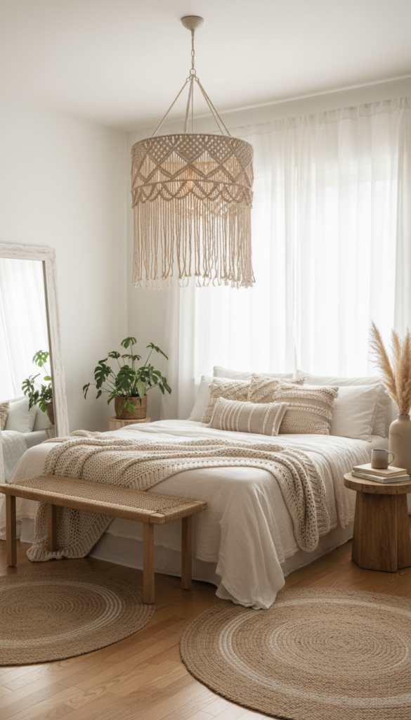 The 1970s revival brought macramé back into the spotlight, and it fits perfectly in a boho bedroom. A lamp shade featuring knotted cotton cords adds softness and texture. You can find these as chandeliers or simple covers for bedside lamps. The fringe helps diffuse the light, preventing glare and ensuring the room feels intimate and relaxed.