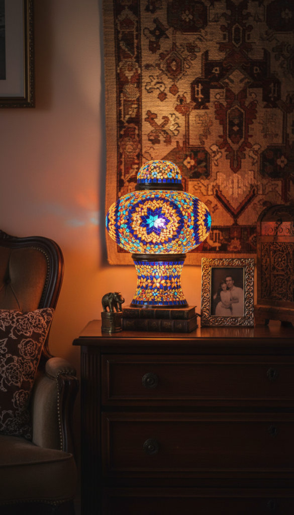 For those who lean towards the “eclectic” side of bohemian style, a Turkish mosaic lamp adds vibrant color and pattern. Made from cut glass and beads, these lamps act as functional art pieces. When illuminated, they project jewel-toned colors onto your surroundings. A small table lamp in this style adds a worldly, traveled feel to the room.