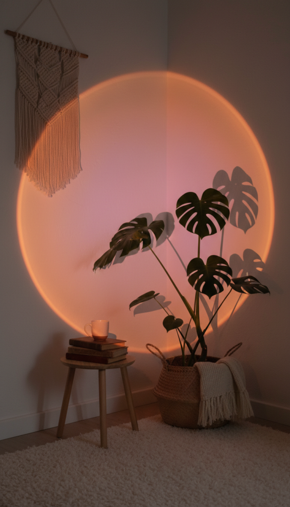 While traditional boho leans on natural materials, modern boho embraces trendy tech that enhances the mood. Sunset projection lamps have taken social media by storm for a reason. They project a circular, gradient light that mimics a setting sun. Aiming one of these at a blank wall creates an instant golden-hour aesthetic, perfect for relaxation or capturing photos of your decor.