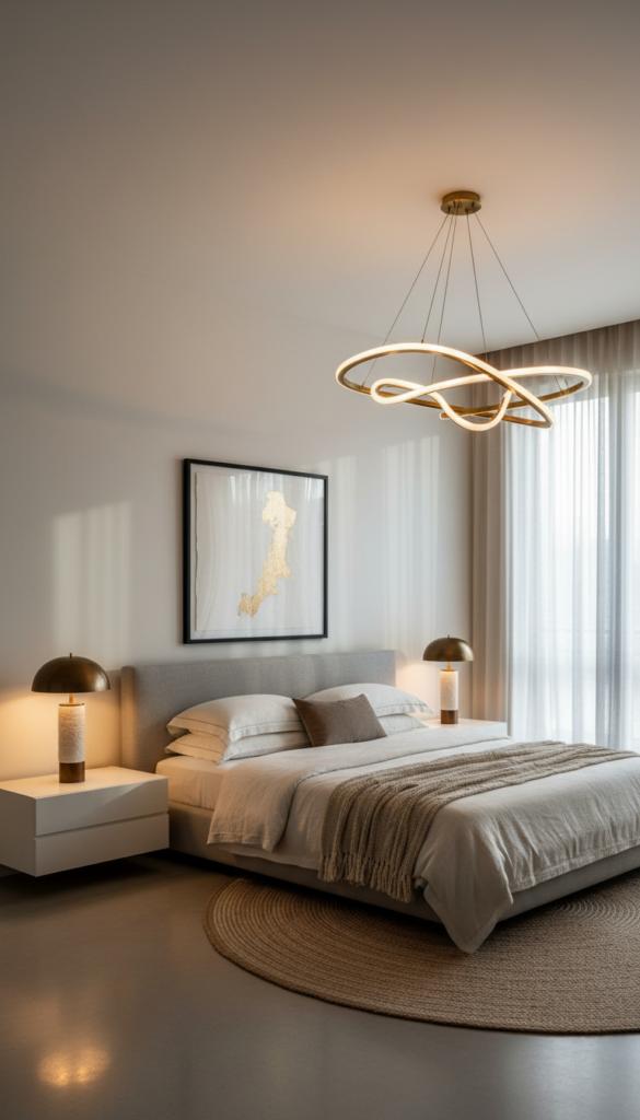 - Install a statement pendant light or chandelier centered over the bed or in the middle of the room.