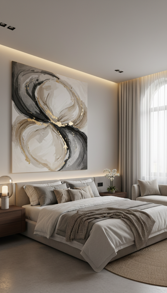 - Choose abstract art or calm landscapes in neutral tones to maintain a serene bedroom vibe.