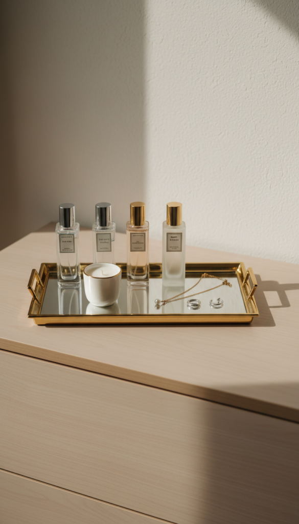 Small details matter. A cluttered nightstand can ruin a photo, but a styled surface elevates it. Decorative trays are perfect for corralling small items like jewelry, candles, and perfumes, turning everyday objects into a chic vignette.