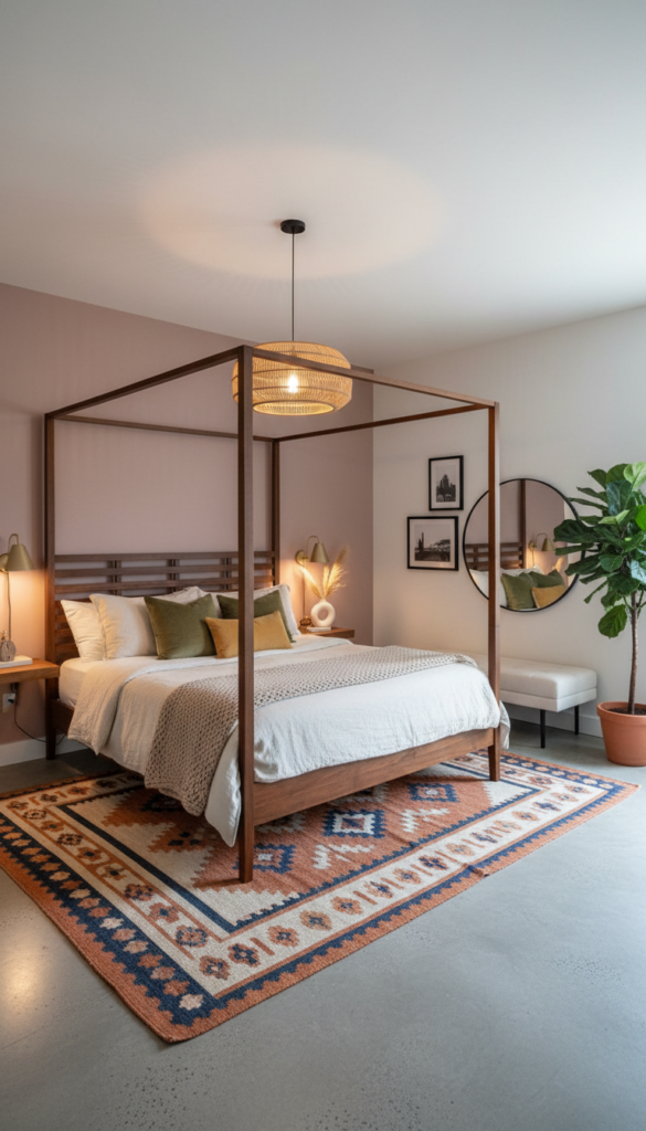 - Layer a patterned vintage-style rug over a neutral carpet for a bohemian feel.