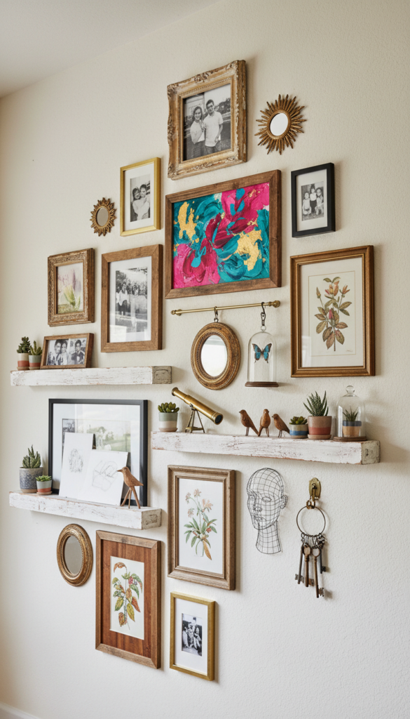 - Mix frame sizes, colors, and textures for visual interest.
