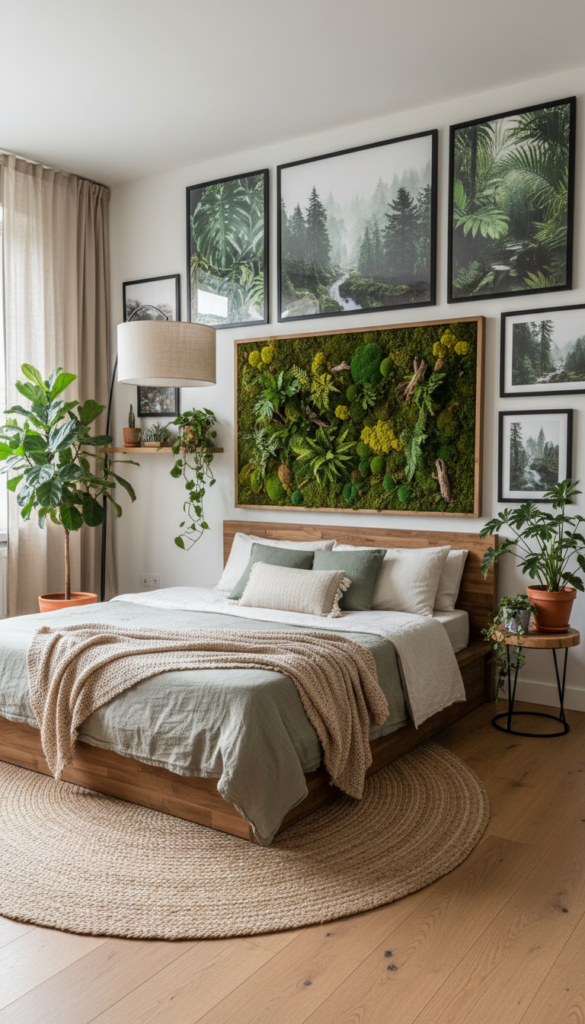 - Choose wall décor made from sustainable materials like moss or wood.