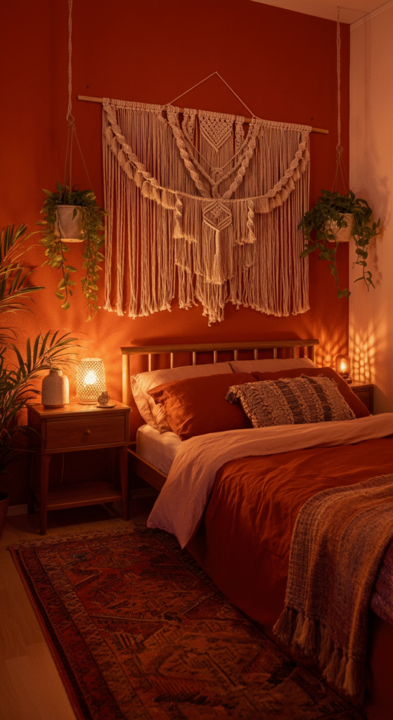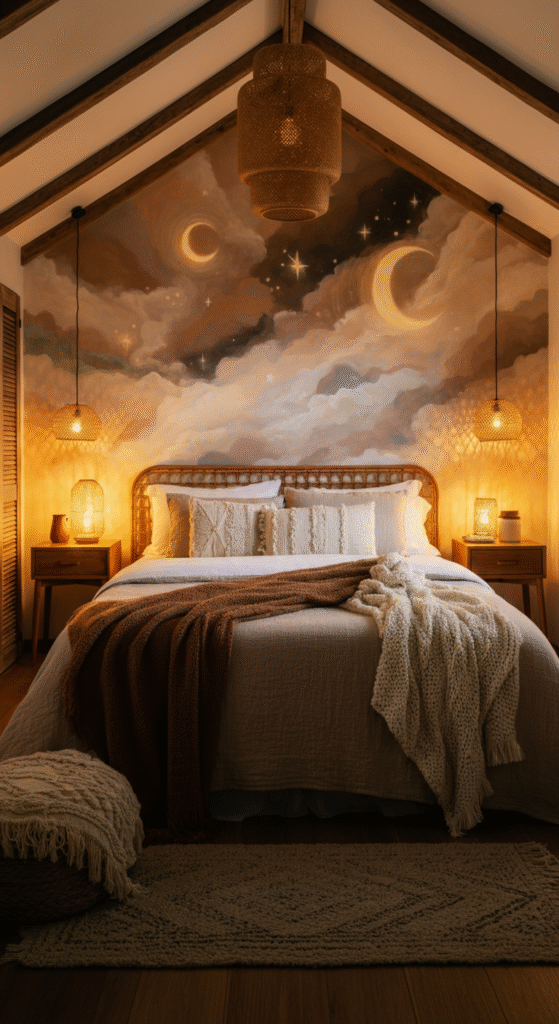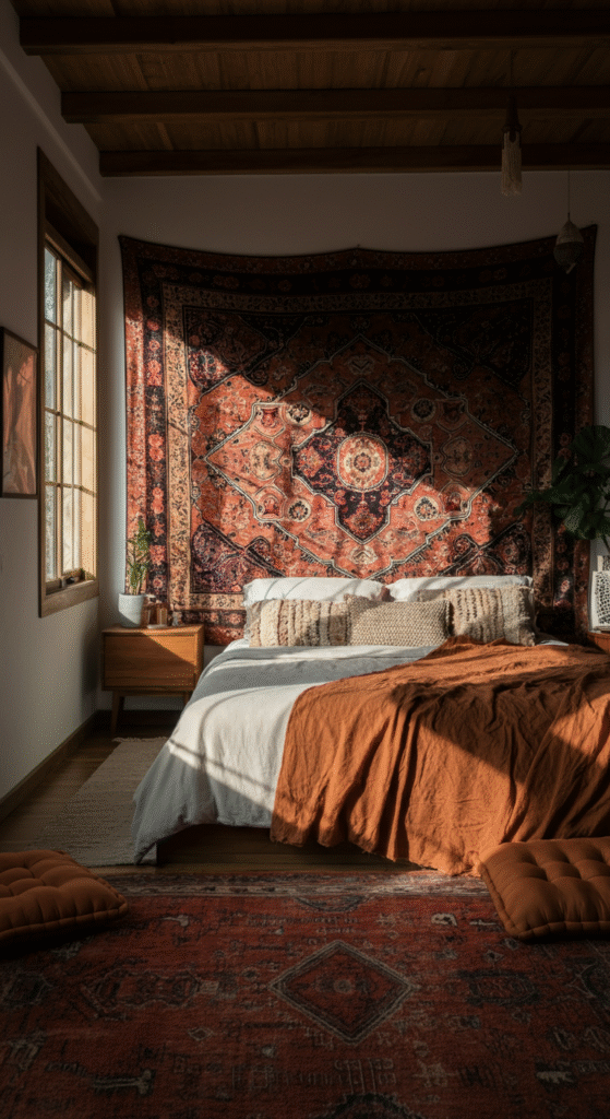 But what truly sets a Bohemian bedroom apart is the accent wall. These focal points become the heartbeat of the room, adding depth, personality, and warmth in a way that no other element can.