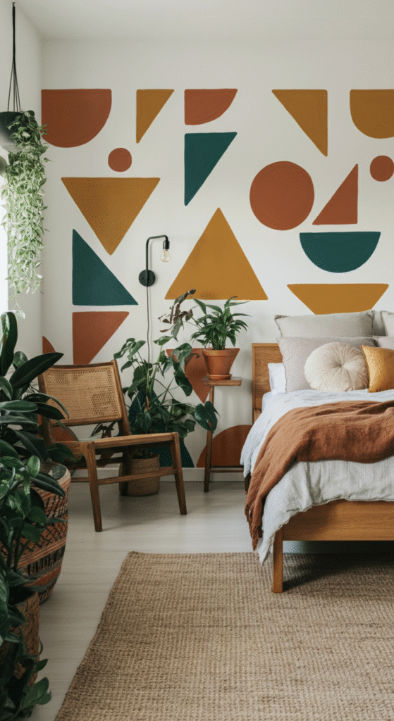If you’re looking for something modern yet boho, painted geometric shapes on your accent wall are the perfect choice. Incorporate triangular, circular, or diamond shapes in earthy hues like terracotta, mustard, or teal to maintain the bohemian spirit. Mix and match different sizes and colors for a playful, artistic vibe.