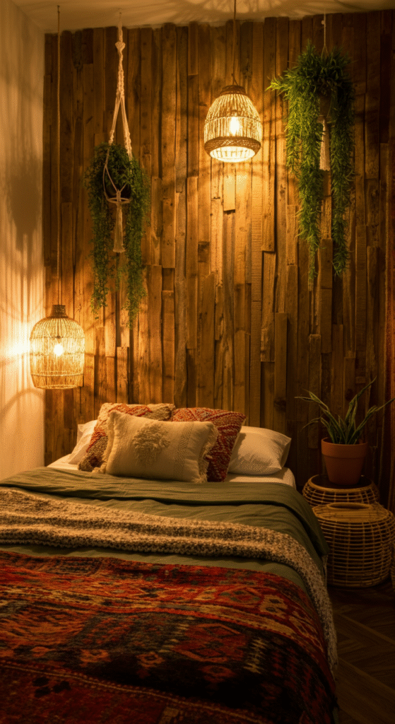 For a Bohemian bedroom with earthy, rustic charm, a wooden accent wall is an excellent choice. Use reclaimed wood, unfinished planks, or even bamboo to create a natural backdrop that enhances the organic feel of your room.