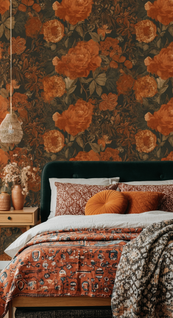 Why it works: Wallpaper adds a rich, textured look to the room without the need for paint or additional artwork. It’s perfect for creating a statement wall that blends well with the eclectic nature of Bohemian décor.