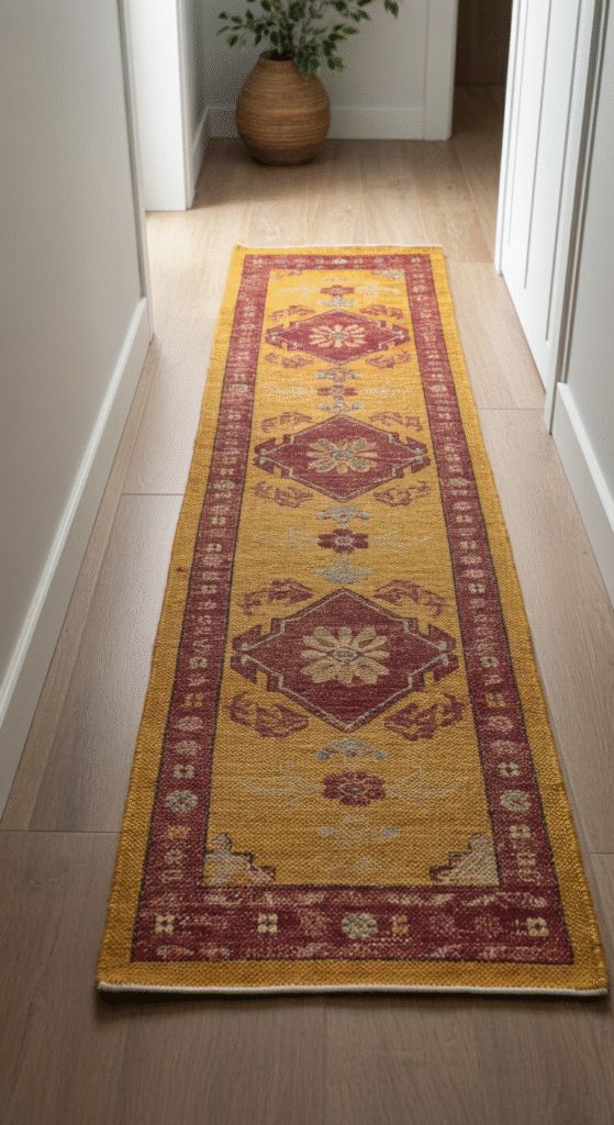 When it comes to creating a boho-inspired hallway, one of the easiest ways to add personality is by incorporating a rug runner with earthy tones and intricate patterns. Rugs made from natural materials like jute, wool, and cotton bring warmth and texture to the hallway while grounding the space.